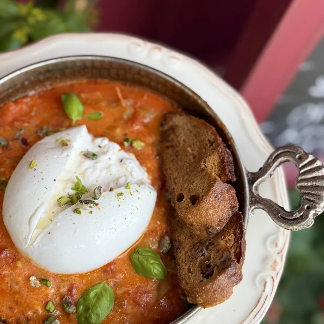 Domates sos, stracciatella peyniri, kekik, sarımsak, zeytinyağı